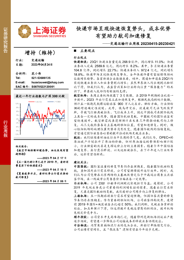 上海证券:交通运输行业周报:快递市场呈现快速恢复势头,成本优势有望助力航司加速修复.pdf
