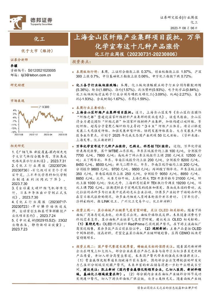 德邦证券:化工行业周报:上海金山区纤维产业集群项目获批,万华化学宣布这十几种产品涨价.pdf