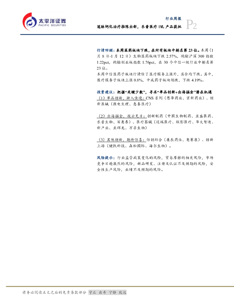 太平洋证券:生物医药II行业周报:冠脉钙化治疗推陈出新,乐普医疗IVL产品获批.pdf