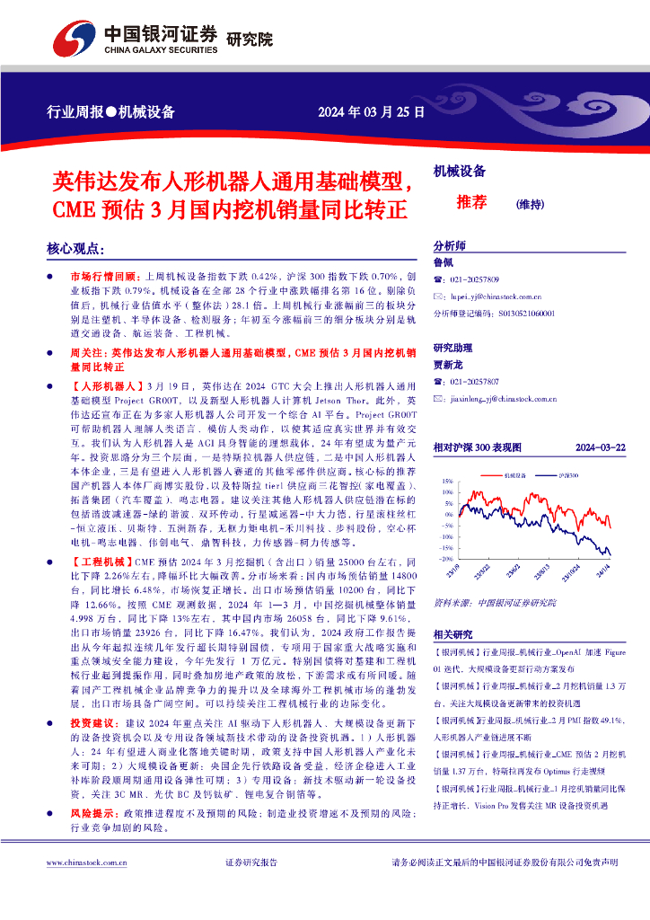 中国银河:机械设备行业周报●机械设备:英伟达发布人形机器人通用基础模型,CME预估3月国内挖机销量同比转正.pdf