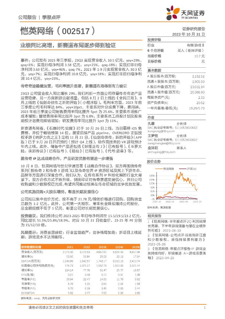 天风证券:恺英网络(002517)-业绩同比高增,新赛道布局逐步得到验证.pdf