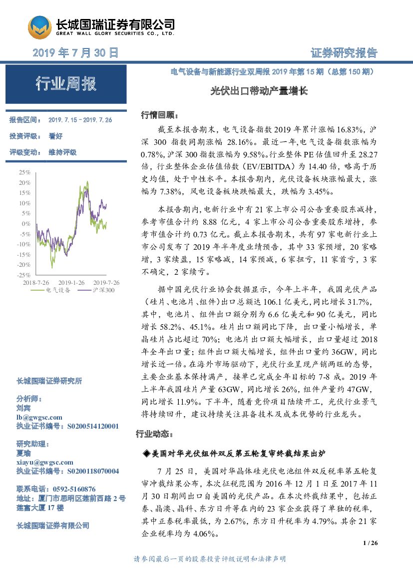 长城国瑞证券:电气设备与新能源行业双周报2019年第15期(总第150期):光伏出口带动产量增长.pdf