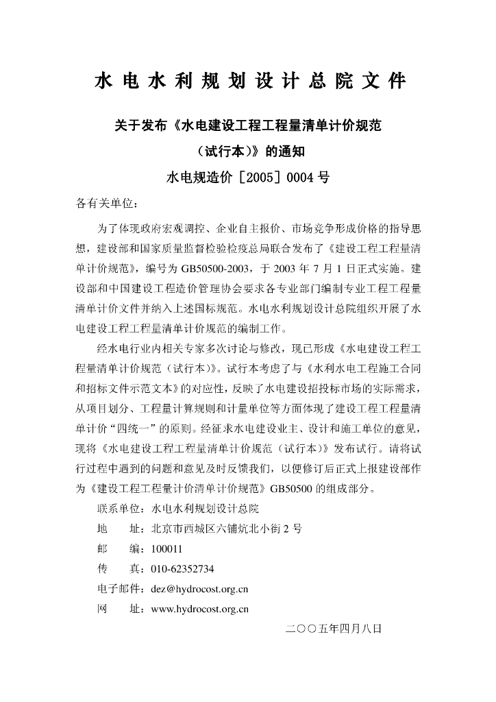 水电水利规划设计总院:水电建设工程工程量清单计价规范(试行本).pdf