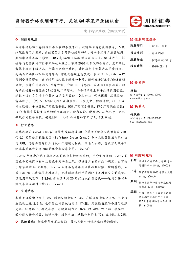 川财证券:电子行业周报:存储器价格或继续下行,关注Q4苹果产业链机会.pdf