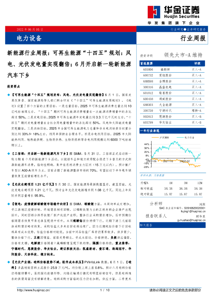 华金证券:新能源行业周报:可再生能源“十四五”规划:风电、光伏发电量实现翻倍;6月开启新一轮新能源汽车下乡.pdf