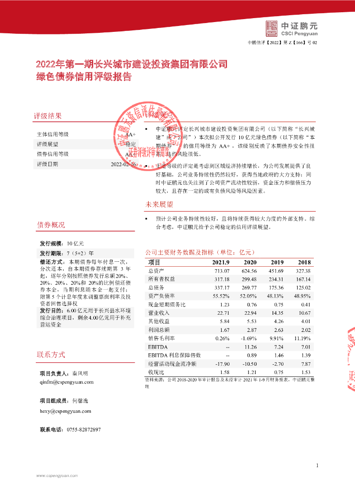 鹏元:2022年第一期长兴城市建设投资集团有限公司绿色债券信用评级报告.pdf