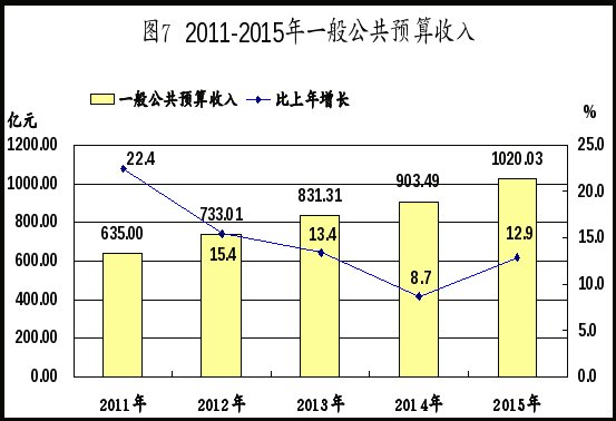 财政收支结构优化。全年完成一般公共预算收入1020.03亿元,比上年增长12.9%(剔除原政府性基金收入后同口径增长9.3%)。其中,税收收入838.67亿元,比上年增长10.8%,占一般公共预算收入的比重为82.2%。民生领域支出增长较快。全年一般公共预算支出1045.18亿元,比上年增长13.5%。其中,住房保障支出增长44.0%、教育支出增长29.3%、社会保障和就业支出增长21.8%、交通运输支出增长21.6%、医疗卫生与计划生育支出增长18.5%,增幅均高于一般公共预算支出平均水平。