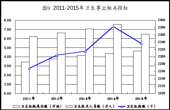 卫生事业持续发展。全市各类医疗卫生机构2337个,其中医院、卫生院及社区卫生服务中心336个,疾病预防控制中心17个,妇幼卫生保健机构14个。年末各类卫生机构共有病床4.66万张,其中医院、卫生院床位数4.16万张,分别比上年增加0.3、0.25万张。各类卫生机构共有卫生技术人员6.51万人,其中执业(助理)医师2.23万人,注册护士3.50万人,分别比上年增加0.31、0.07、0.77万人。累计建成社区卫生服务中心(卫生院)139个、社区卫生服务站(村卫生室)691个。社区卫生服务城市人口覆盖率达到100%。共建立13所市级惠民医院。