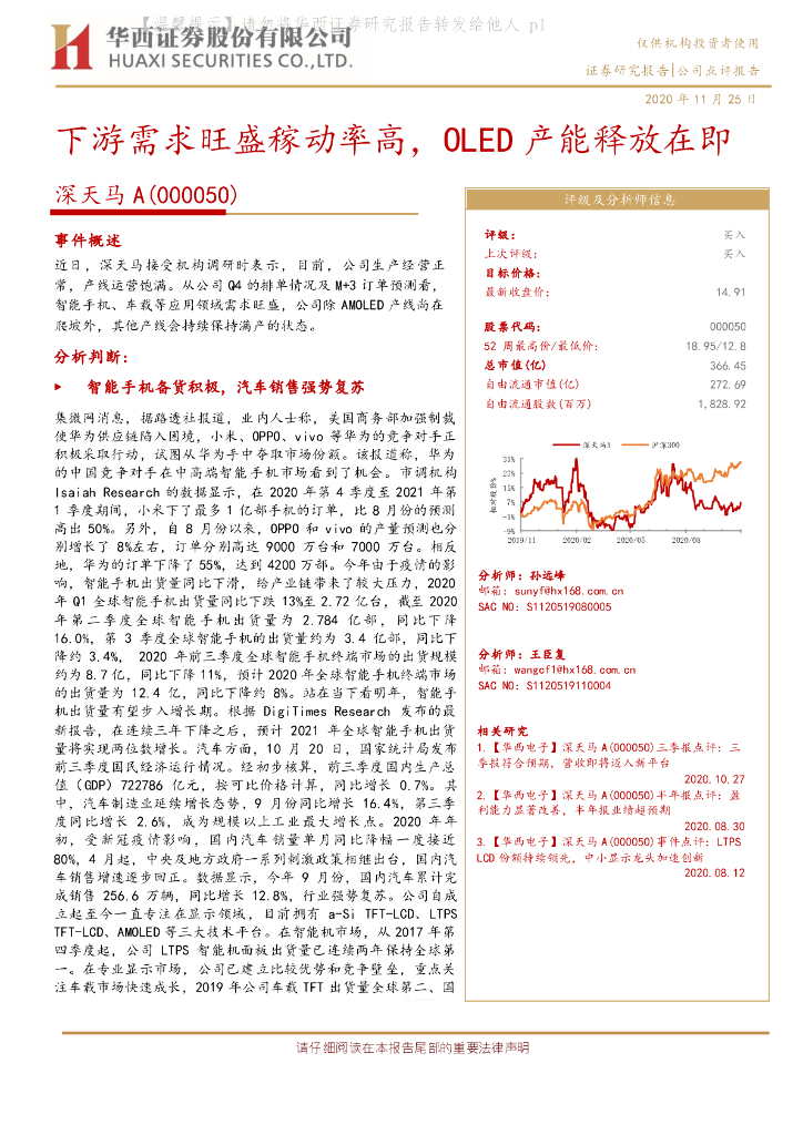 华西证券:深天马A(000050)-下游需求旺盛稼动率高,OLED产能释放在即.pdf