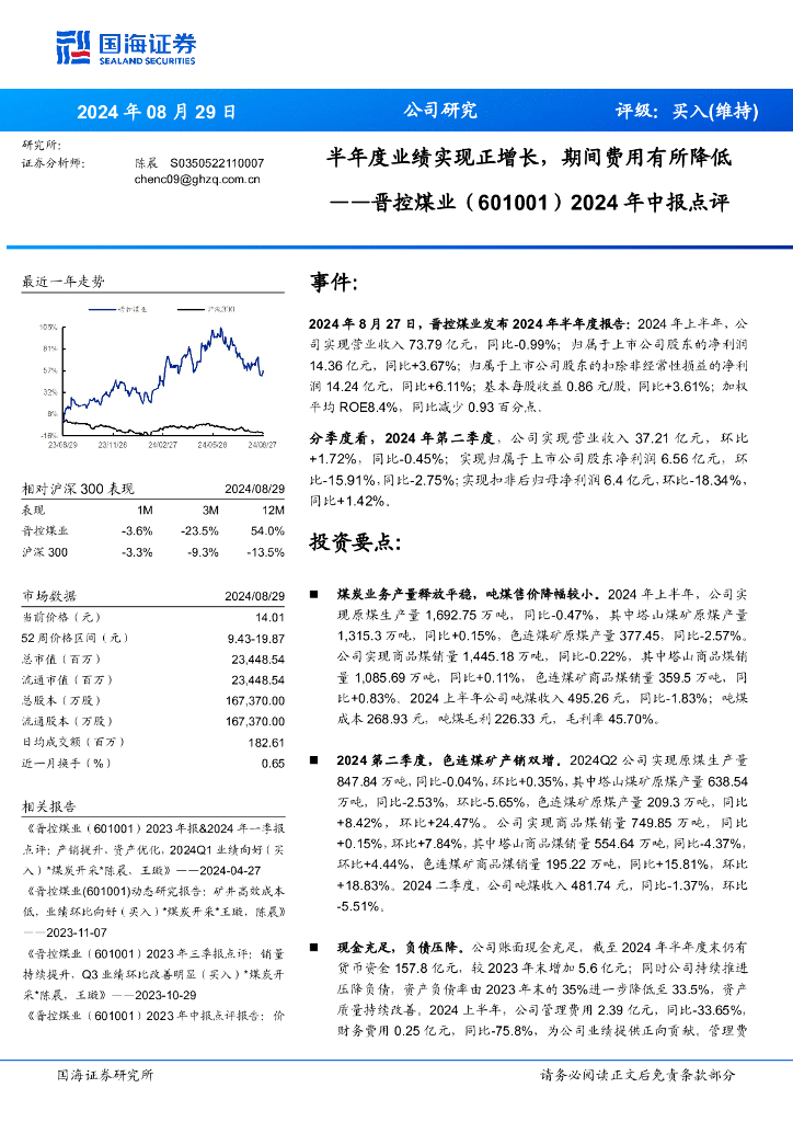 国海证券:晋控煤业(601001)-2024年中报点评:半年度业绩实现正增长,期间费用有所降低.pdf