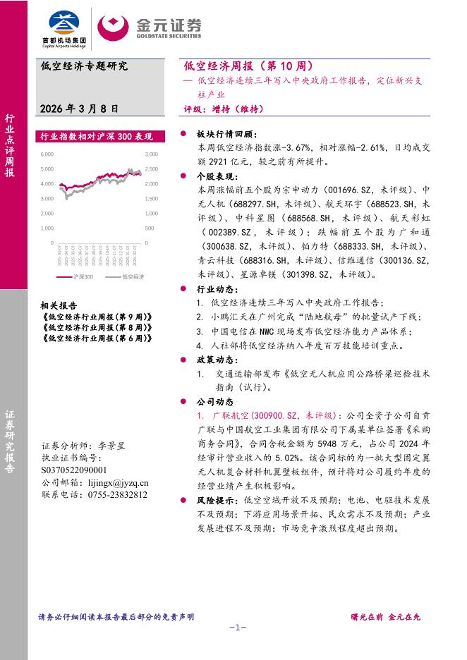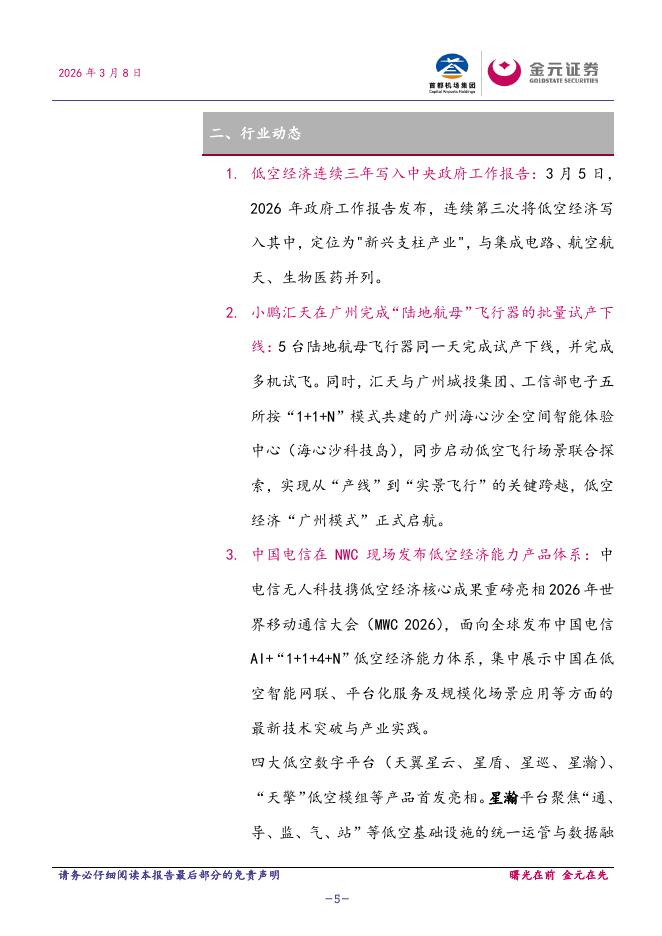 金元证券:低空经济周报(第10周):低空经济连续三年写入中央政府工作报告,定位新兴支柱产业.pdf