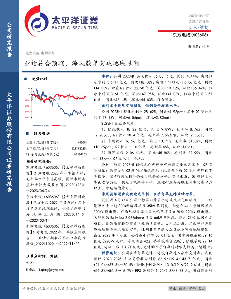 太平洋证券:东方电缆(603606)-业绩符合预期,海风获单突破地域限制.pdf