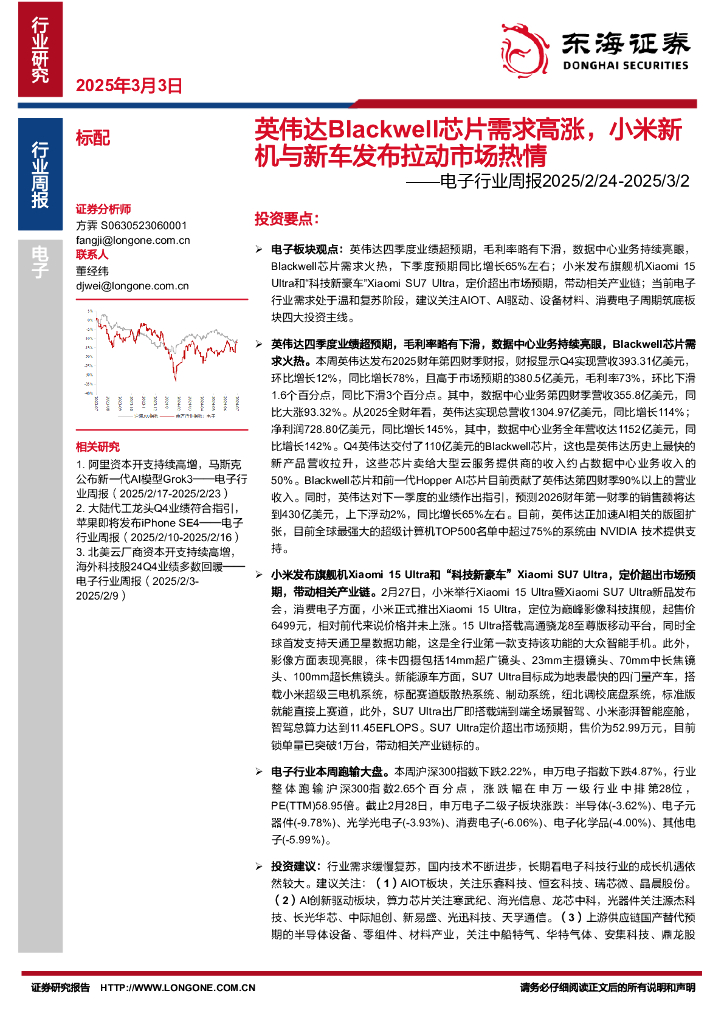 东海证券:电子行业周报:英伟达Blackwell芯片需求高涨,小米新机与新车发布拉动市场热情.pdf