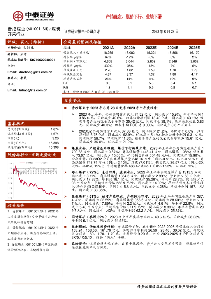 中泰证券:晋控煤业(601001)-产销稳定、煤价下行、业绩下滑.pdf