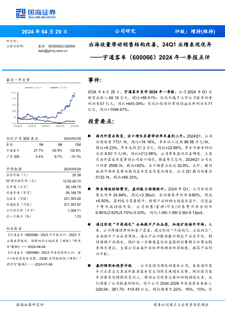 国海证券:宇通客车(600066)-2024年一季报点评:出海放量带动销售结构改善,24Q1业绩表现优异.pdf