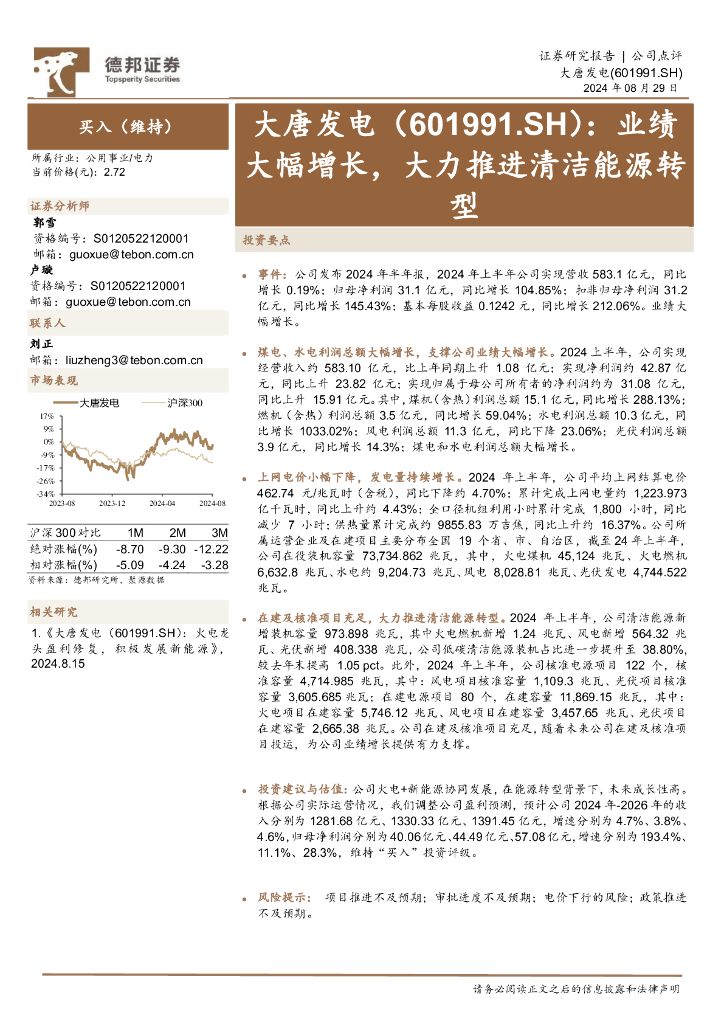 德邦证券:大唐发电(601991)-业绩大幅增长,大力推进清洁能源转型.pdf