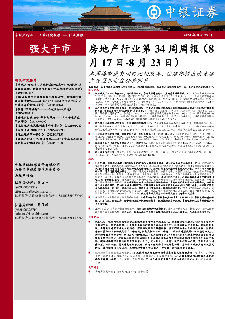中银证券:房地产行业第34周周报:本周楼市成交同环比均改善;住建部提出试点建立房屋养老金公共账户.pdf