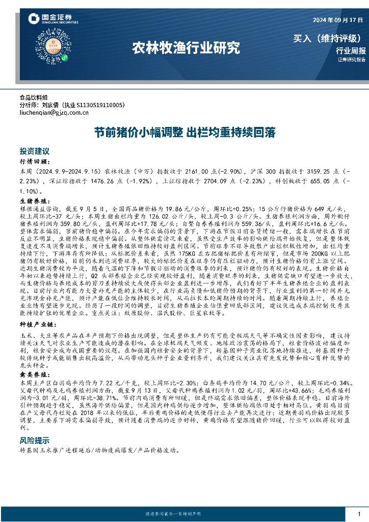 国金证券:农林牧渔行业周报:节前猪价小幅调整,出栏均重持续回落.pdf
