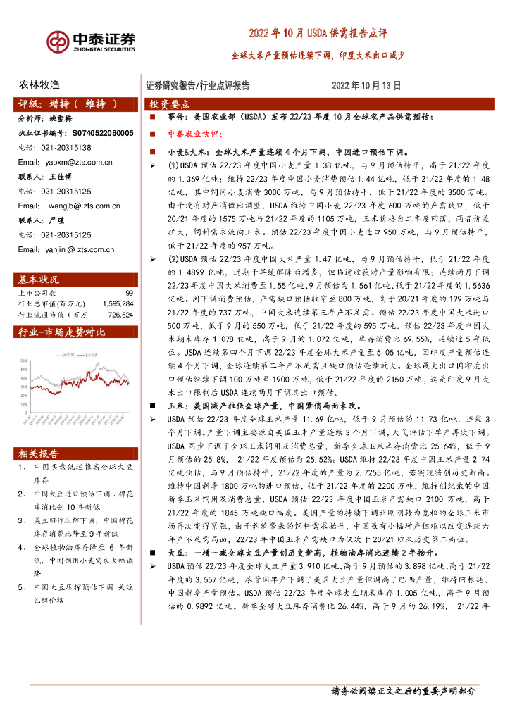 中泰证券:2022年10月USDA供需报告点评:全球大米产量预估连续下调,印度大米出口减少.pdf
