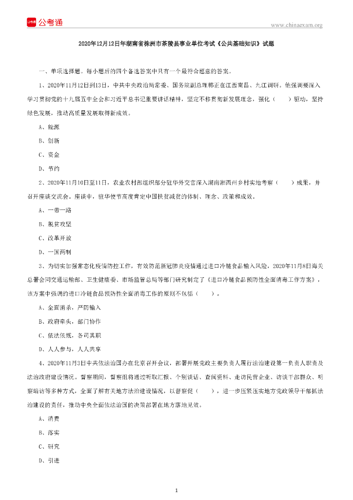 2020年12月12日年湖南省株洲市茶陵县事业单位考试《公共基础知识》试题.pdf
