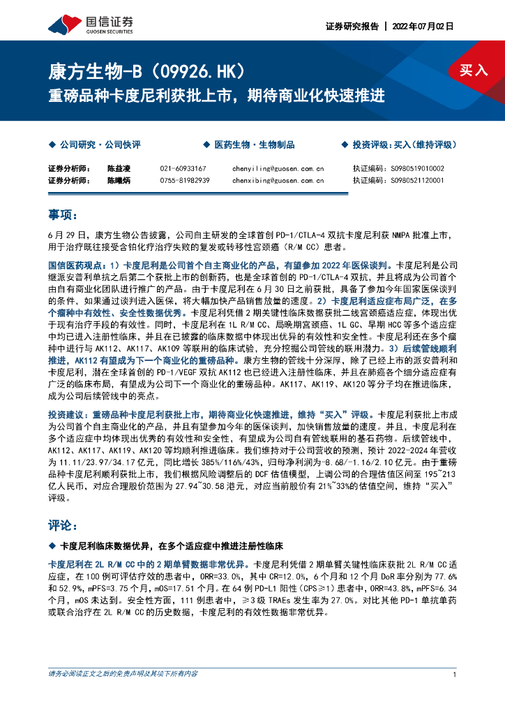 国信证券:康方生物(09926)港股公司研究报告-重磅品种卡度尼利获批上市,期待商业化快速推进.pdf