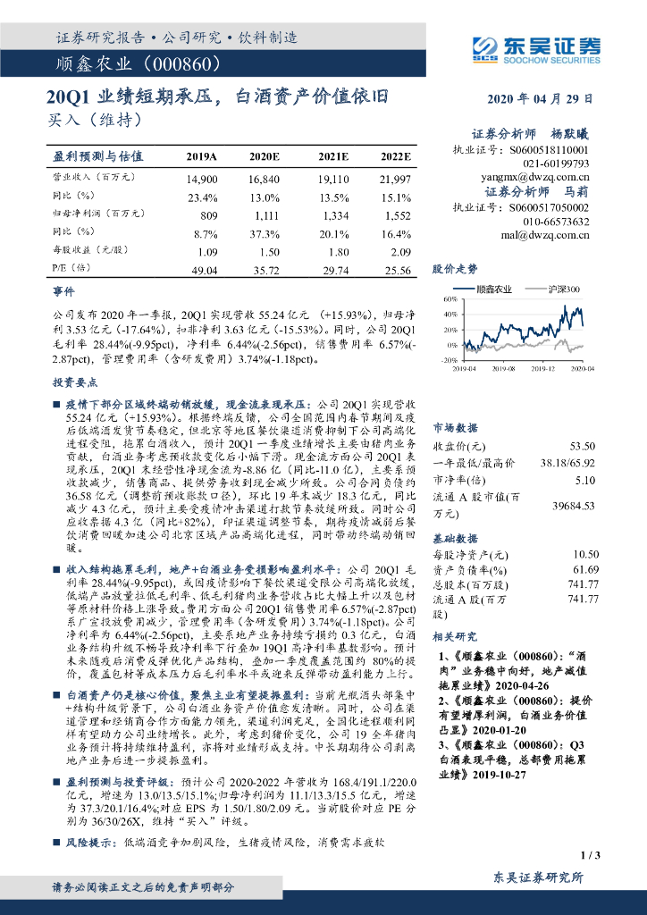 东吴证券:顺鑫农业(000860)-20Q1业绩短期承压,白酒资产价值依旧.pdf