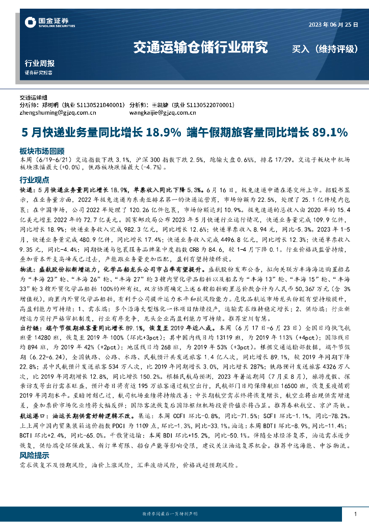 国金证券:交通运输仓储行业研究:5月快递业务量同比增长18.9%,端午假期旅客量同比增长89.1%.pdf