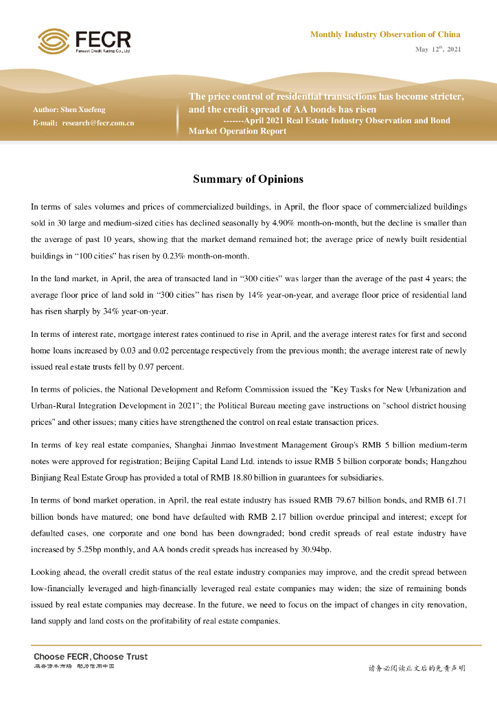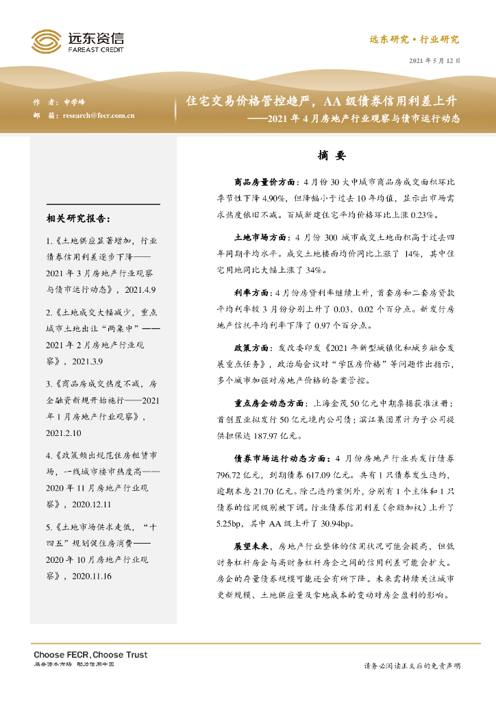 远东资信:住宅交易价格管控趋严,AA级债券信用利差上升——2021年4月房地产行业观察与债市运行动态报告.pdf