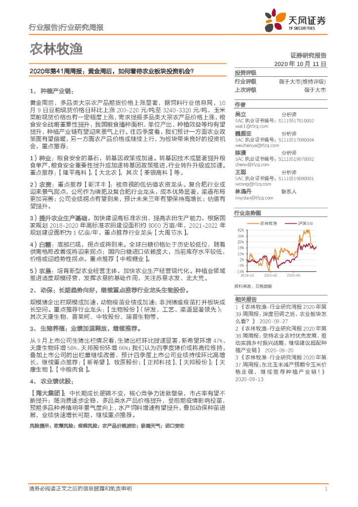 天风证券:农林牧渔2020年第41周周报:黄金周后,如何看待农业板块投资机会?.pdf
