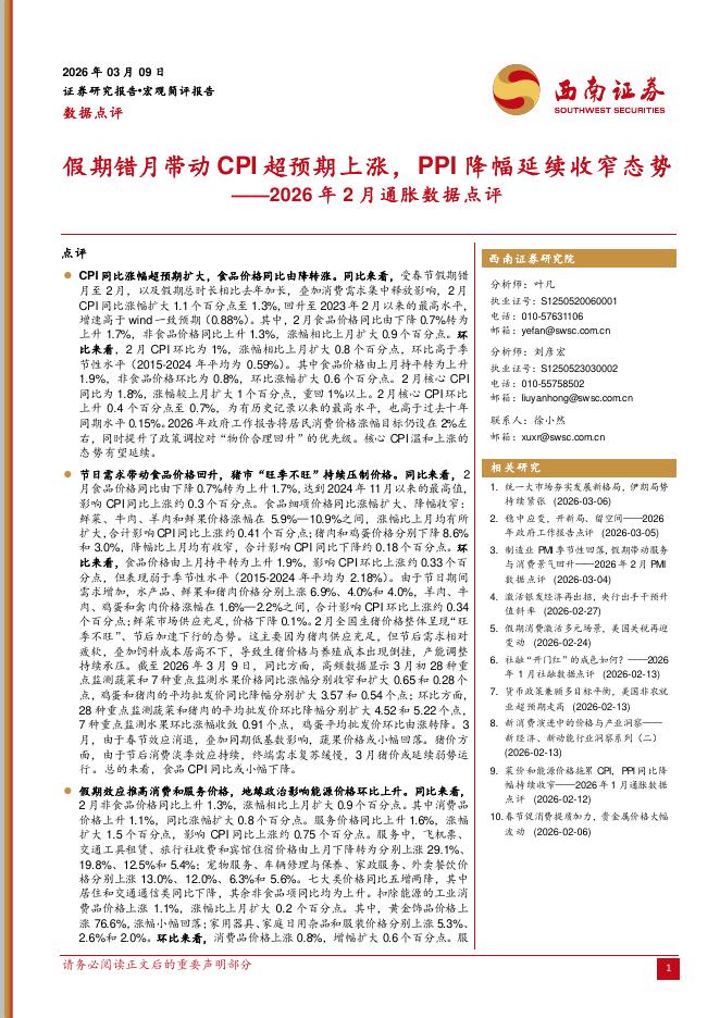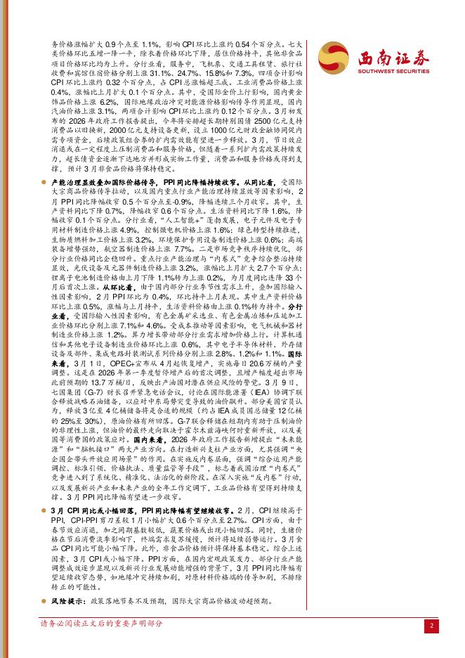 西南证券:2026年2月通胀数据点评:假期错月带动CPI超预期上涨,PPI降幅延续收窄态势-260310.pdf