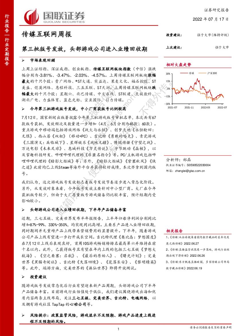国联证券:传媒互联网周报:第三批版号发放,头部游戏公司进入业绩回收期.pdf