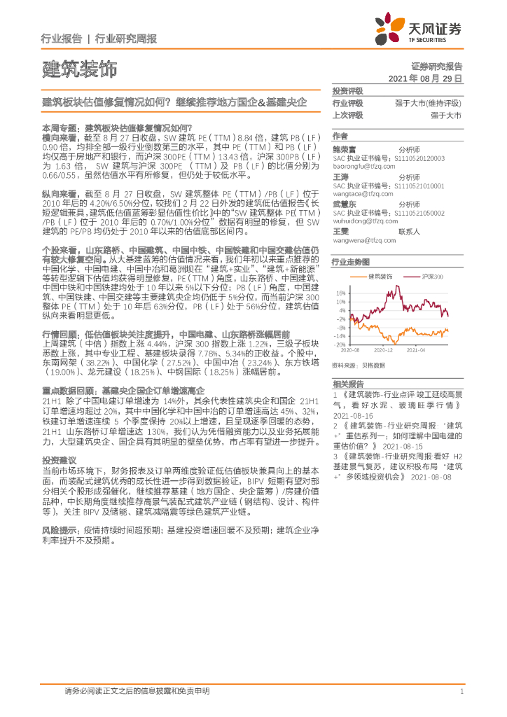 天风证券:建筑装饰行业研究周报:建筑板块估值修复情况如何? 继续推荐地方国企&基建央企.pdf