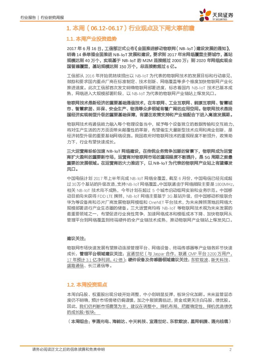 天风证券:通信行业研究周报:工信部力推+运营商加速布局,NB-IoT站上爆发风口.pdf