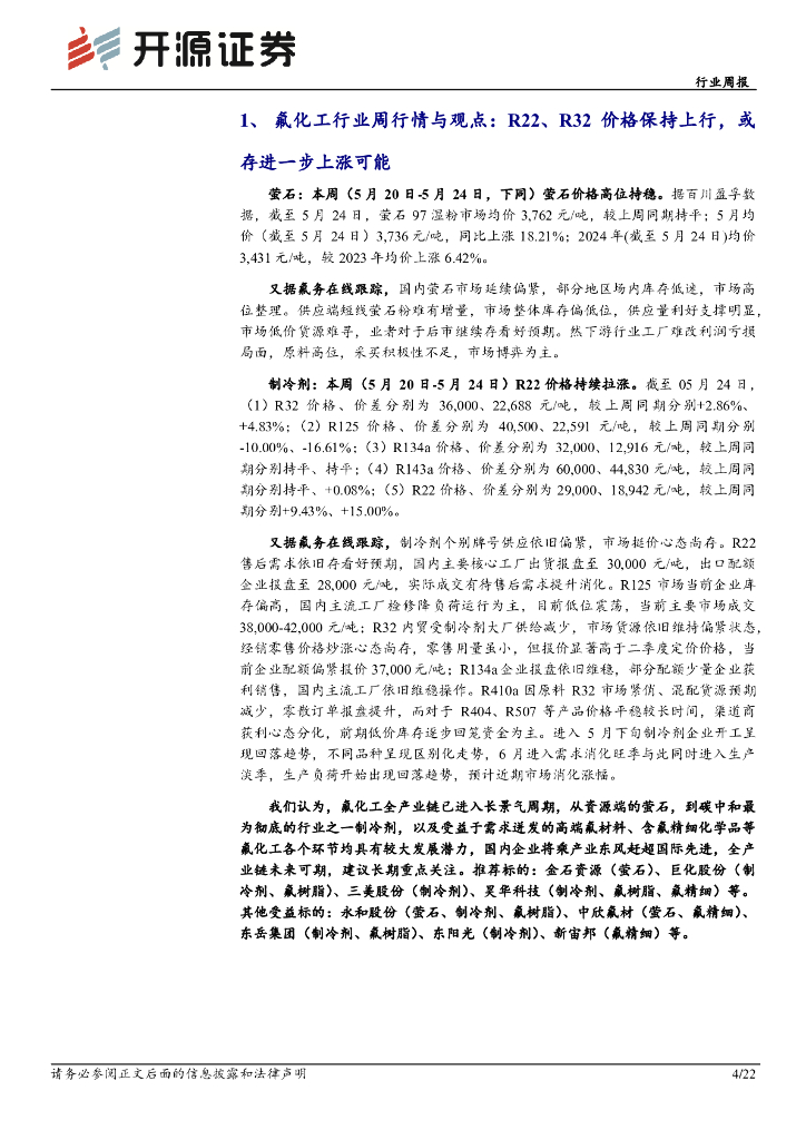 开源证券:氟化工行业周报:R22、R32价格保持上行,或存进一步上涨可能.pdf