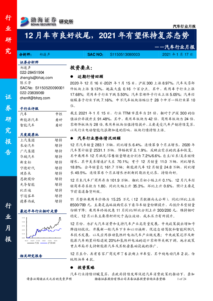 渤海证券:汽车行业月报:12月车市良好收尾,2021年有望保持复苏态势.pdf