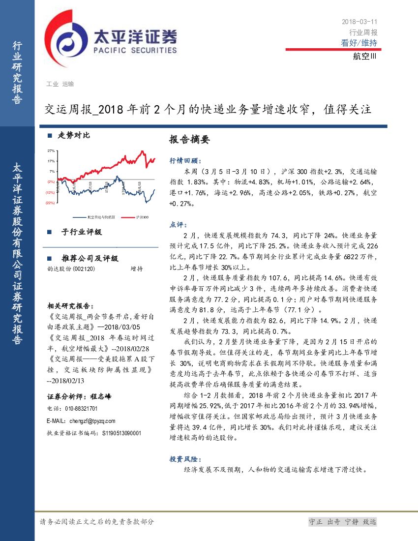 太平洋证券:交运周报:2018年前2个月的快递业务量增速收窄,值得关注.pdf
