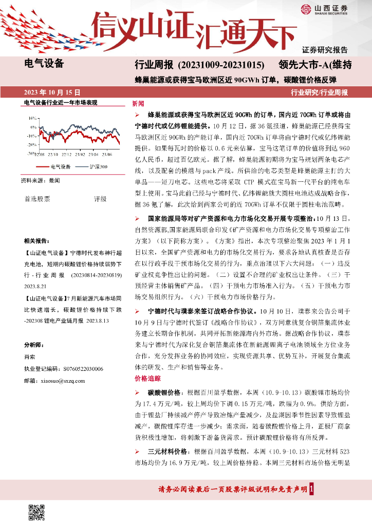 山西证券:电气设备行业周报:蜂巢能源或获得宝马欧洲区近90GWh订单,碳酸锂价格反弹.pdf