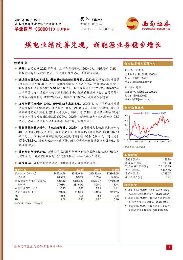 西南证券:华能国际(600011)-煤电业绩改善兑现,新能源业务稳步增长.pdf