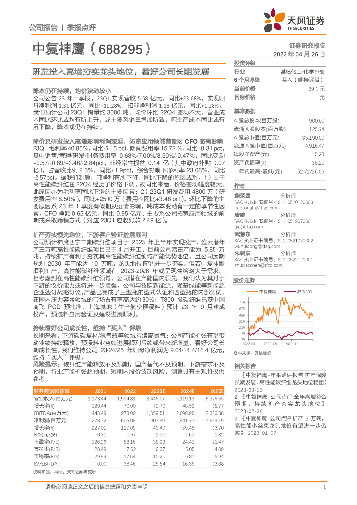 天风证券:中复神鹰(688295)-研发投入高增夯实龙头地位,看好公司长期发展.pdf