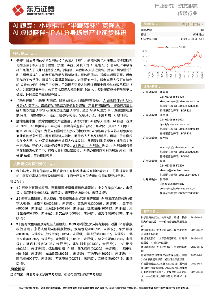 东方证券:传媒行业:AI跟踪:小冰推出“半藏森林”克隆人,AI虚拟陪伴+IPAI分身场景产业逐步推进.pdf