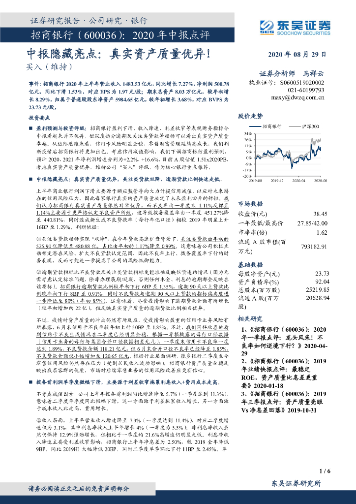 东吴证券:招商银行(600036)-2020年中报点评:中报隐藏亮点:真实资产质量优异!.pdf