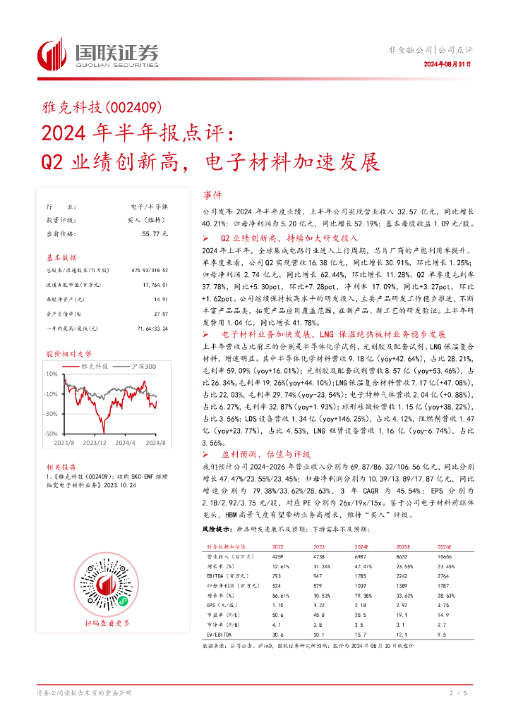 国联证券:雅克科技(002409)-2024年半年报点评:Q2业绩创新高,电子材料加速发展.pdf