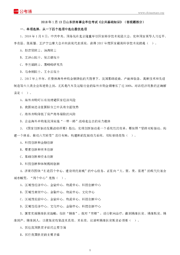 2018年1月13日山东济南事业单位考试《公共基础知识》(客观题部分).pdf