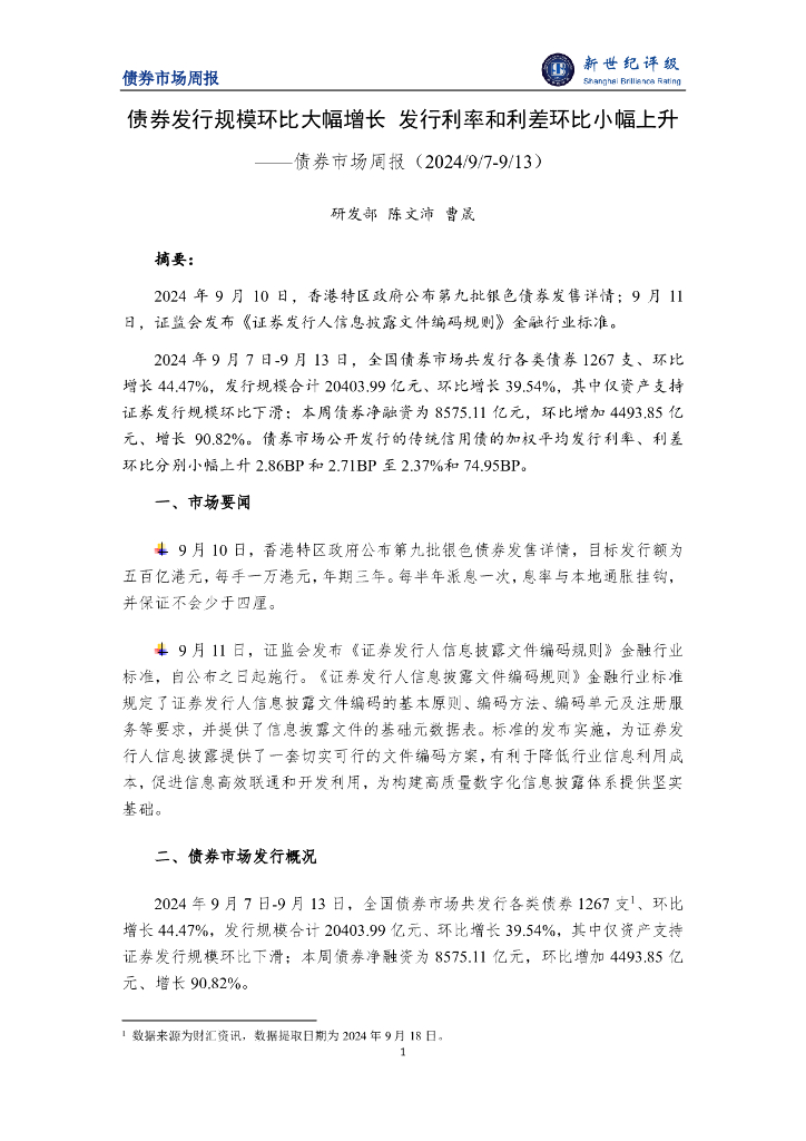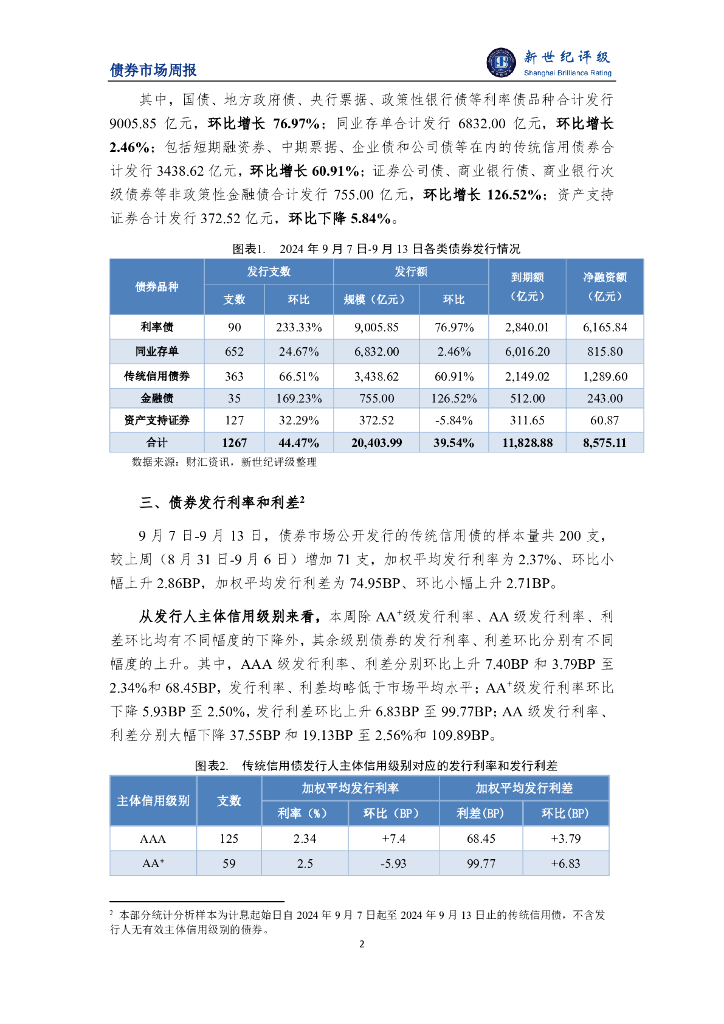 新世纪评级:债券发行规模环比大幅增长 发行利率和利差环比小幅上升——债券市场周报(2024/9/7-9/13).pdf
