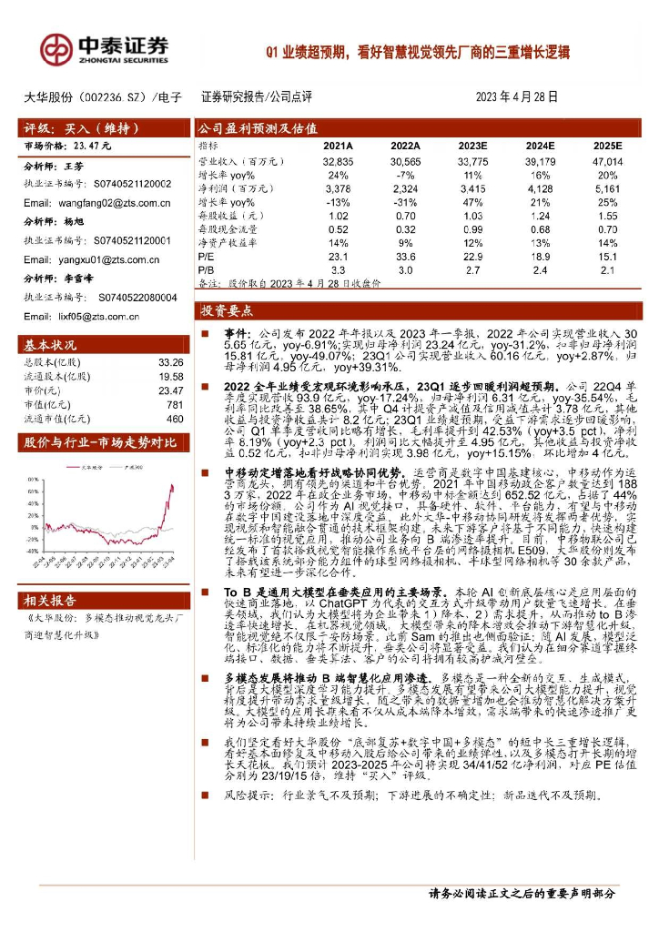 中泰证券:大华股份(002236)-Q1业绩超预期,看好智慧视觉领先厂商的三重增长逻辑.pdf
