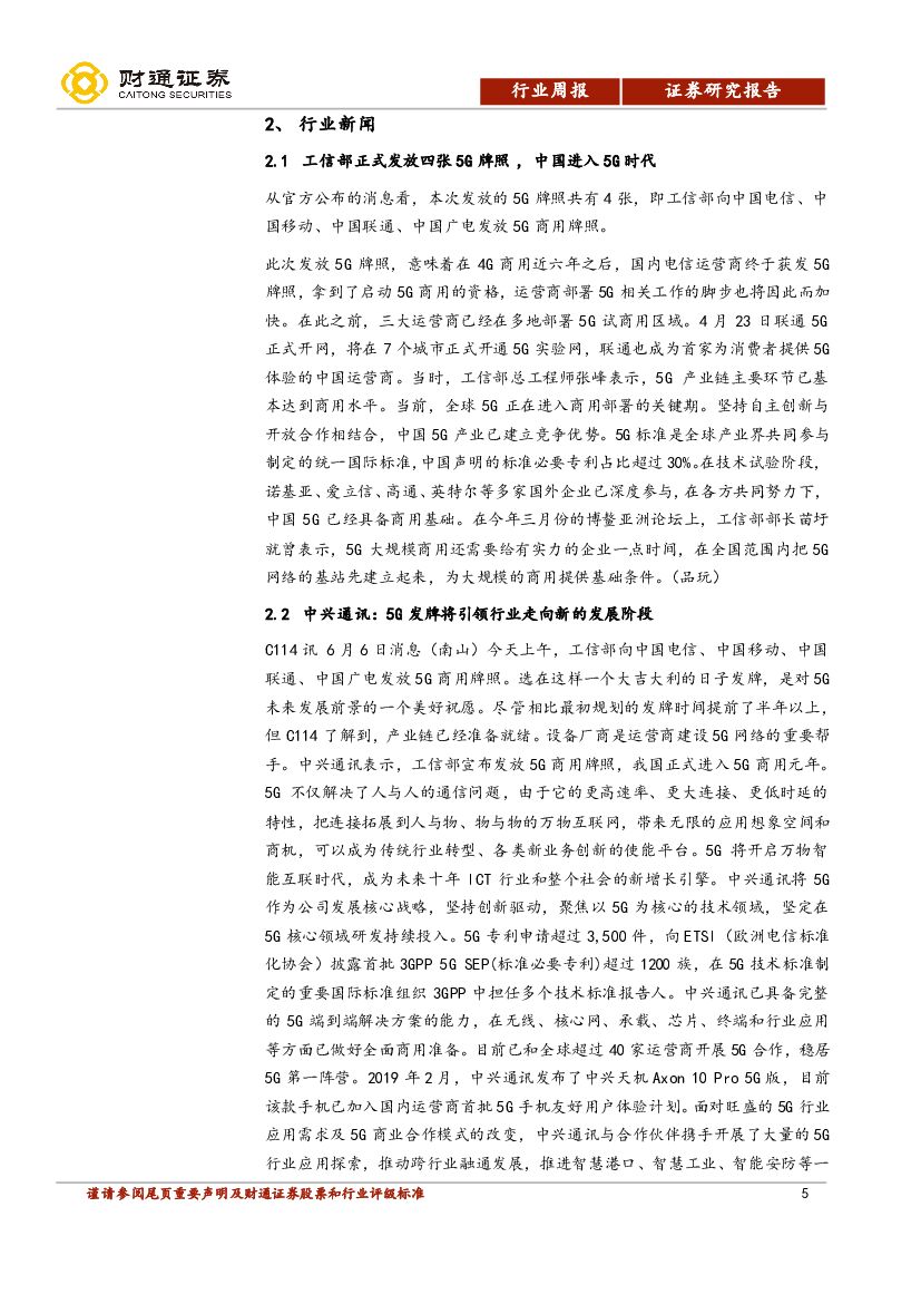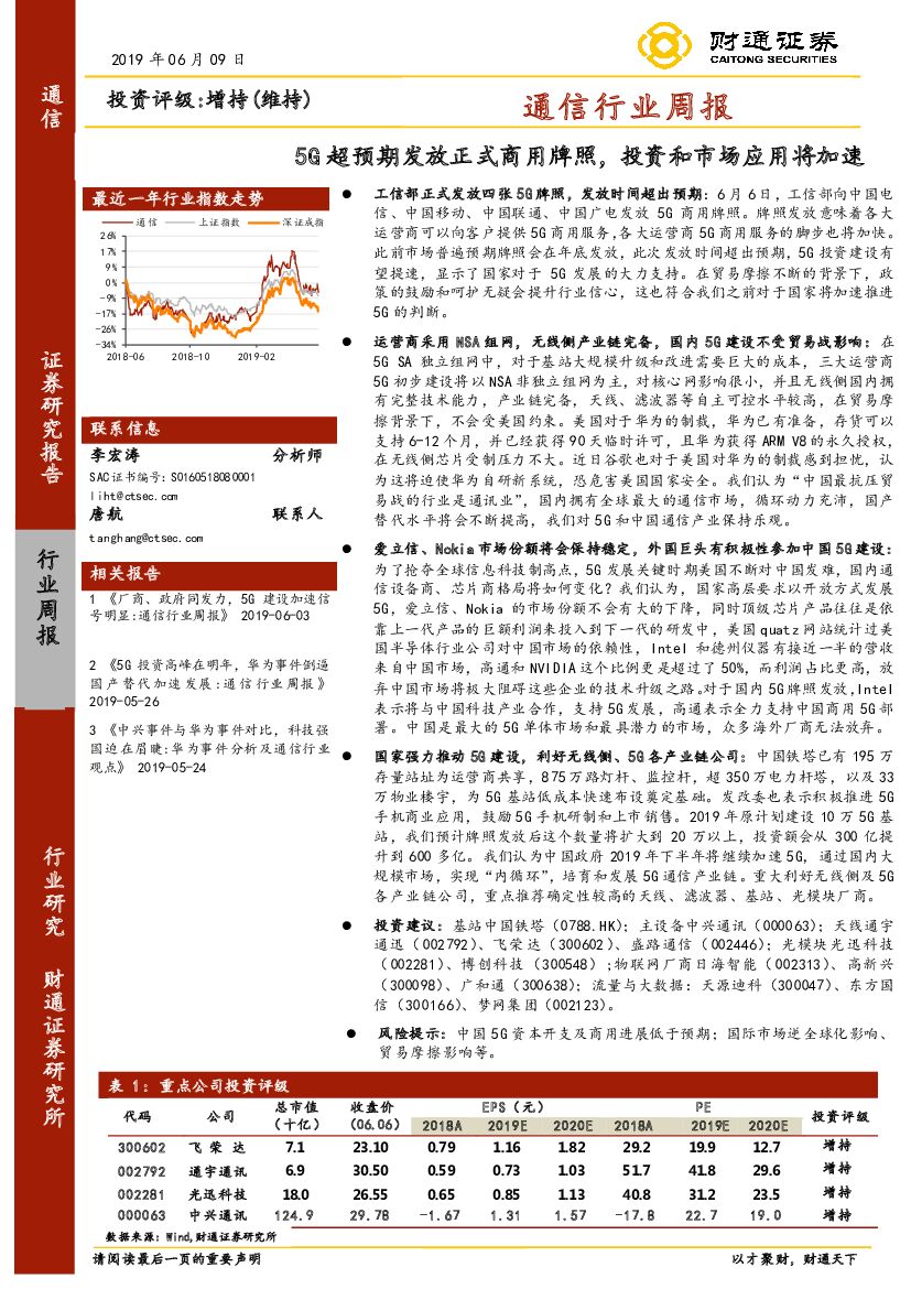 财通证券:通信行业周报:5G超预期发放正式商用牌照,投资和市场应用将加速.pdf