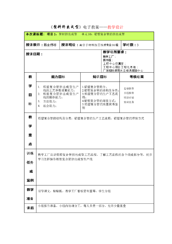 《塑料挤出成型》电子教案-项目2 管材挤出成型 单元10:铝塑复合管的挤出成型.pdf