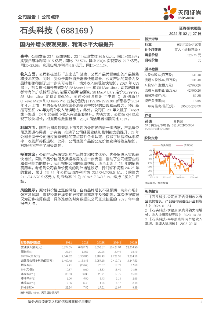 天风证券:石头科技(688169)-国内外增长表现亮眼,利润水平大幅提升.pdf