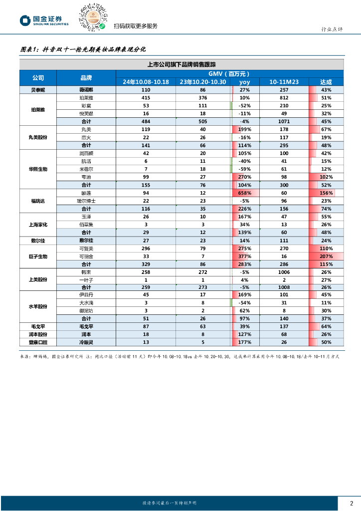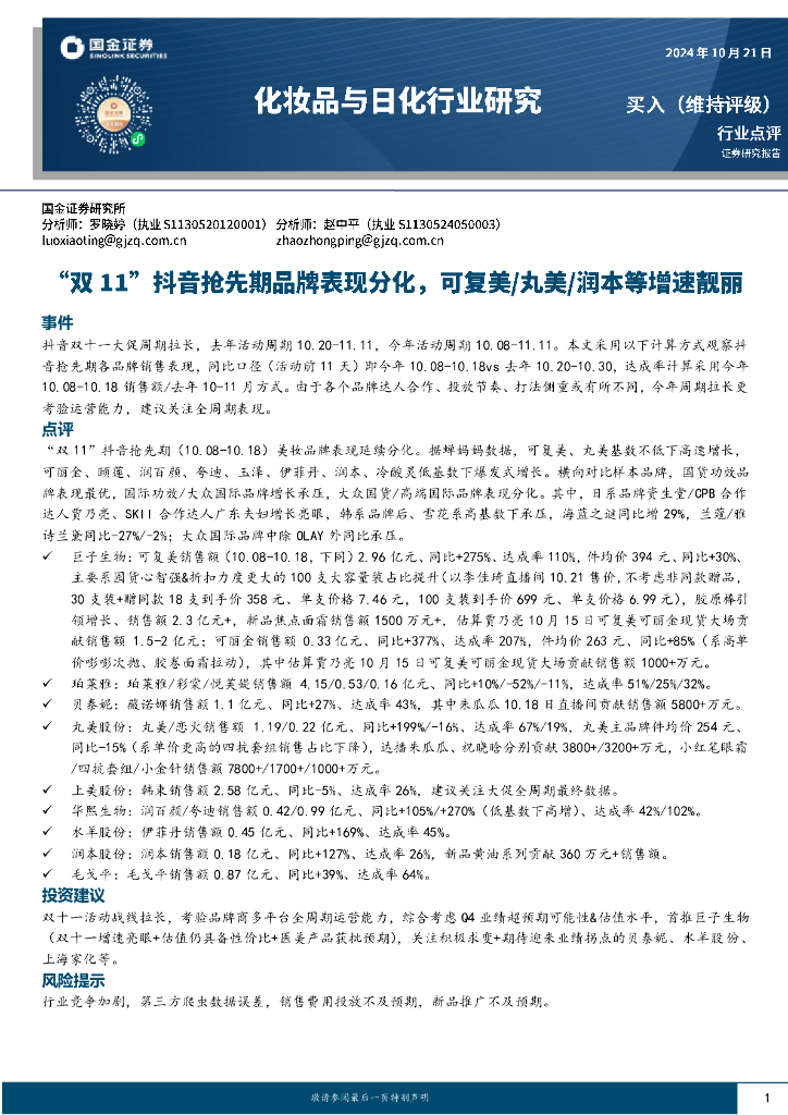 国金证券:化妆品与日化行业研究:“双11”抖音抢先期品牌表现分化,可复美/丸美/润本等增速靓丽.pdf