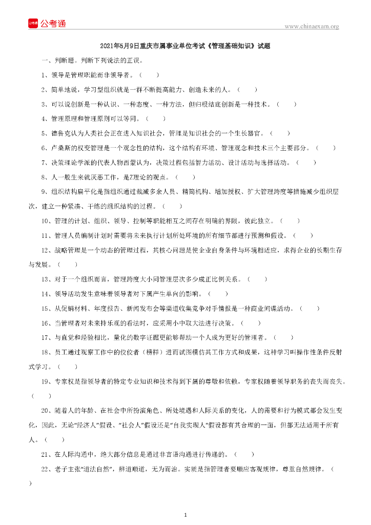 2021年5月9日重庆市属事业单位考试《管理基础知识》试题.pdf